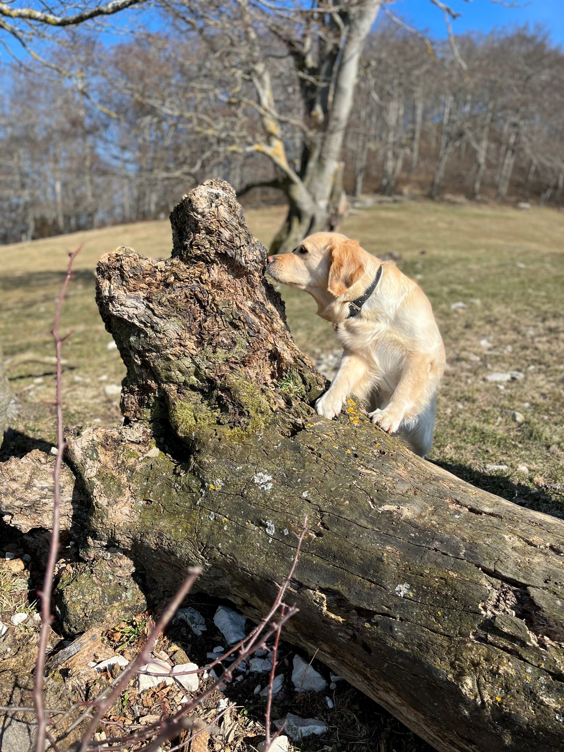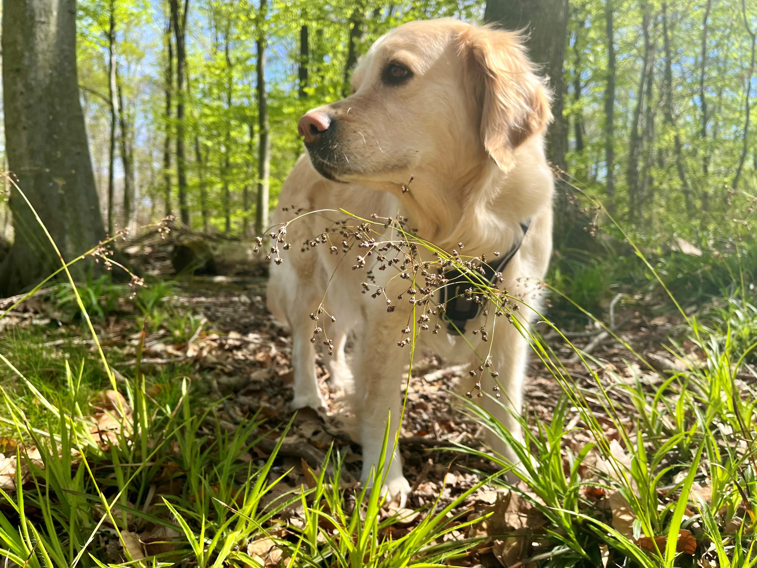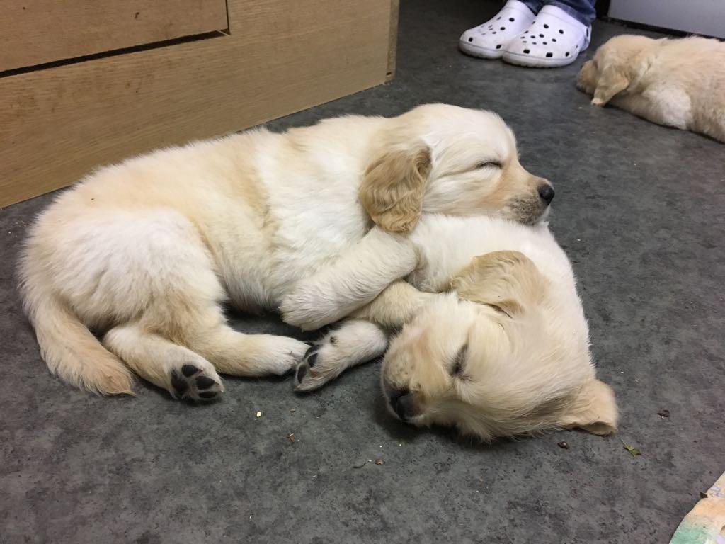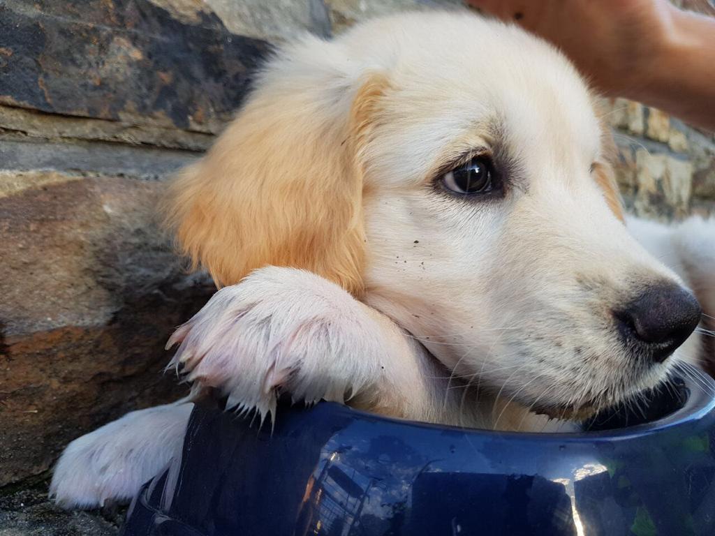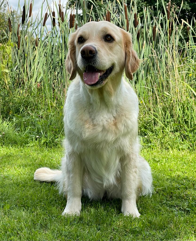 | Wesenstest | Temperament, Bewegungs- und Spieltrieb: Die 18 Monate alte Golden Hündin absolviert den Wesenstest ausgeprägt temperamentvoll und bewegungsfreudig und nutzt das gesamte Gelände beim Spaziergang für sich. Mit großer Begeisterung spielt sie mit allen Menschen und auch mit einigen Gegenständen. Ausdauer, Unerschrockenheit, Härte, Aufmerksamkeit: Sie zeigt sich durchgehend ausgeprägt unerschrocken und ausdauernd und ist dabei stets aufmerksam. Beute- und Bringtrieb, Spür- und Stöbertrieb: Beuteverhalten ist in hohem Maße vorhanden: teils trägt sie und trägt freudig zu, teils spielt sie und trägt für sich. Unterordnung und Bindung: Die Hündin hat eine vertrauensvolle Bindung zu ihren Menschen und ordnet sich problemlos unter. Sicherheit gegenüber Menschen, Kreisprobe, Rückenlage: Menschen gegenüber ist sie sehr interessiert und nimmt gerne und freundlich Kontakt auf. Die einengenden Situationen absolviert sie ganz selbstverständlich. Sicherheit gegenüber optischen und akustischen Reizen: Auf dem Parcours ist sie an allen optischen und akustischen Reizen interessiert. Sie erkundet die Reize selbständig und sicher und braucht nur bei der Kuh eine kleine Unterstützung durch ihren Menschen. Schussfestigkeit: Die Hündin ist schussfest. Bemerkungen: Eine aktive Hündin mit viel Freude an Bewegung und viel Bezug zu Menschen. Richter: Ott |
